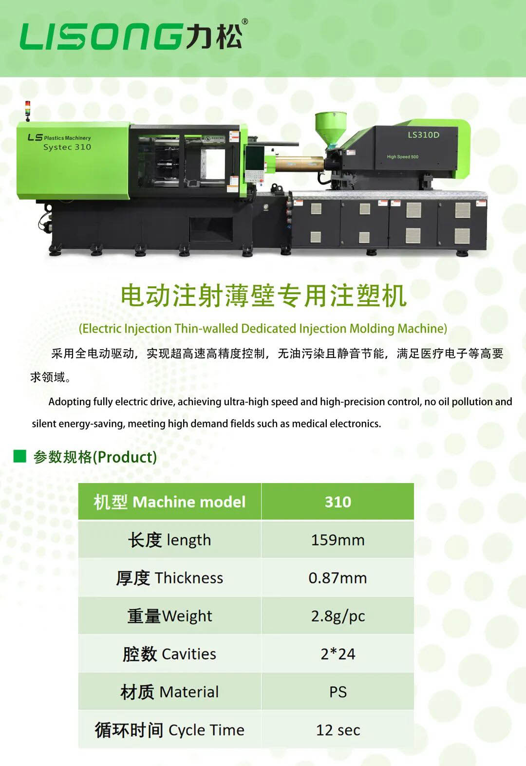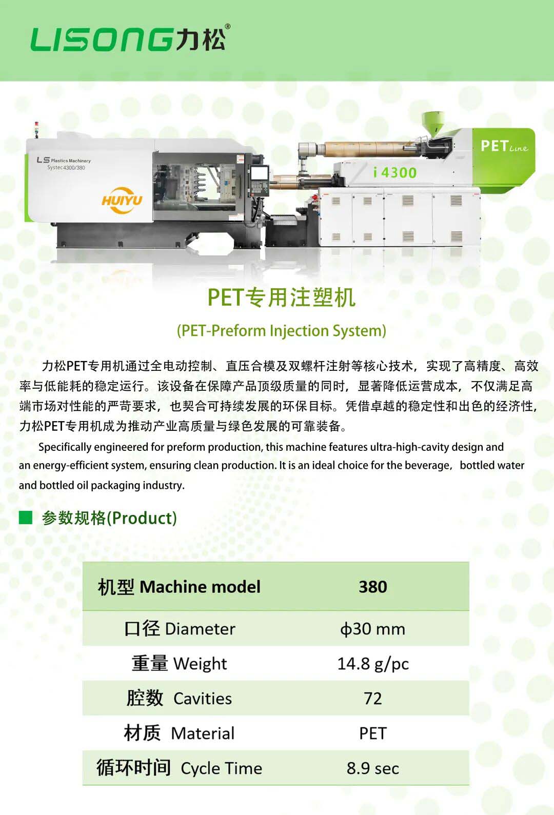 该机型制造30mm瓶胚直径,1出72腔的超高腔数模具,实现了惊人的8.9秒超短周期,单件产品克重精准控制在14.8克。这一组合充分展现了力松在高速、高产量领域的深厚技术底蕴,为瓶坯等包装制品生产商提供了极具竞争力的设备选择。
